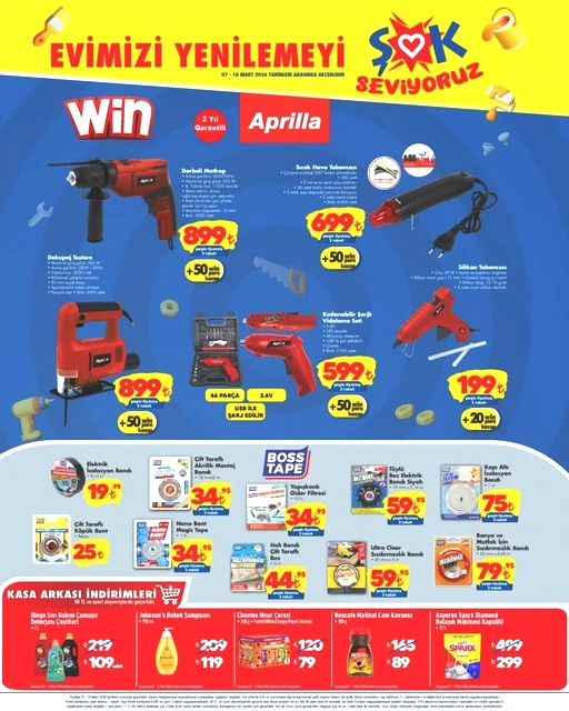 ŞOK'un 7-10 Mart tarihli aktüel katalogu yayımlandı. Bu hafta sonu itibarıyla ŞOK marketlerinde, matkap, şarjlı vidalama seti, testere, silikon tabancası, tavan boyası, merdiven, saplı rulo, tornavida seti, takım çantası, batarya ucu, lavabo filtre süzgeci, ayakkabı, yemek masası, bebek beşiği ve sprey boya gibi birçok ürün, alışveriş tutkunlarının beğenisine sunulacak. İşte ŞOK'un 7 Mart aktüel broşürü ile ilgili detaylar haberimizde...